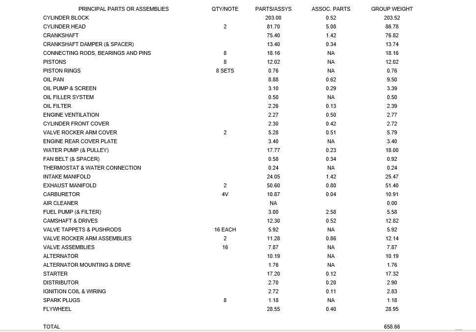 Great chart, Pete.  So, cast iron 427 block and heads together = about 365 pounds.